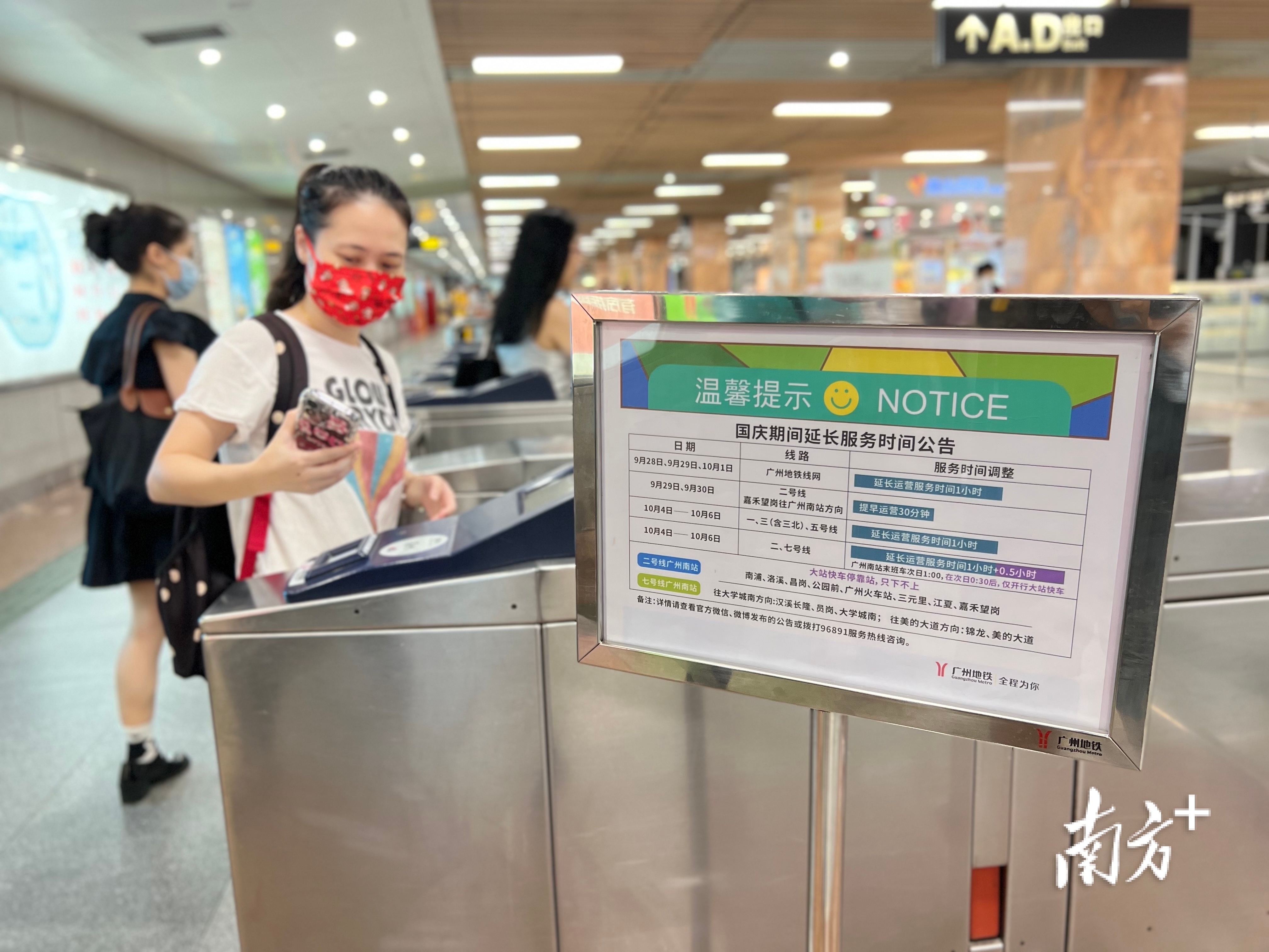 为满足市民节日期间乘车需求,广州地铁将全力做好运营服务保障。9月29日(中秋当天)、10月1日全线网延长运营时间1小时;假期前2天(9月29、30日)二号线嘉禾望岗往广州南站方向提早运营30分钟。