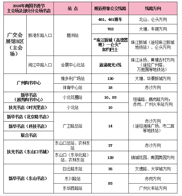想要前往主会场的书友们,可以搭乘461、461班车、763、旅游观光1线、“珠江新城(高德置地)—仑头”如约巴士等,在琶洲站、会展中心北站等站点下车。