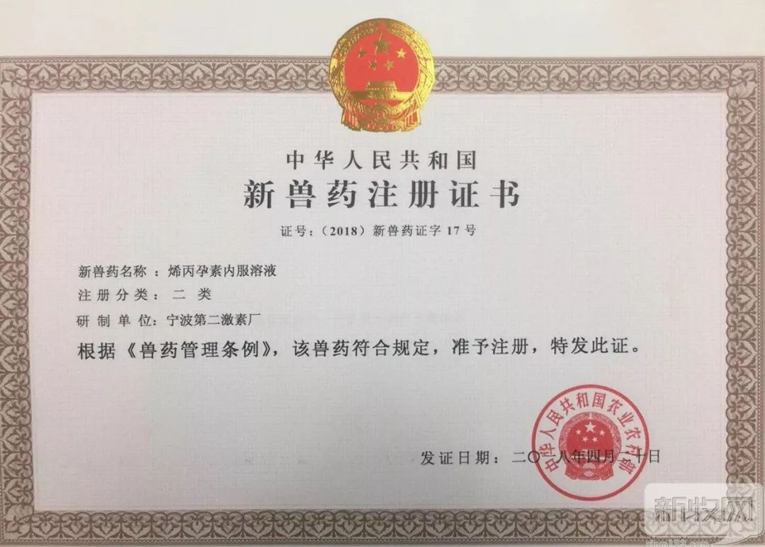 宁波第二激素厂烯丙孕素内服溶液的新兽药注册证书