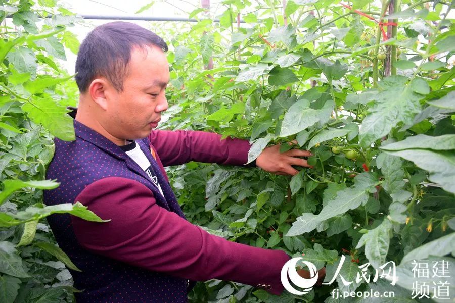 南靖县山城镇下戴村村主任、豪康果蔬专业合作社理事长戴明成查看西红柿生长情况。