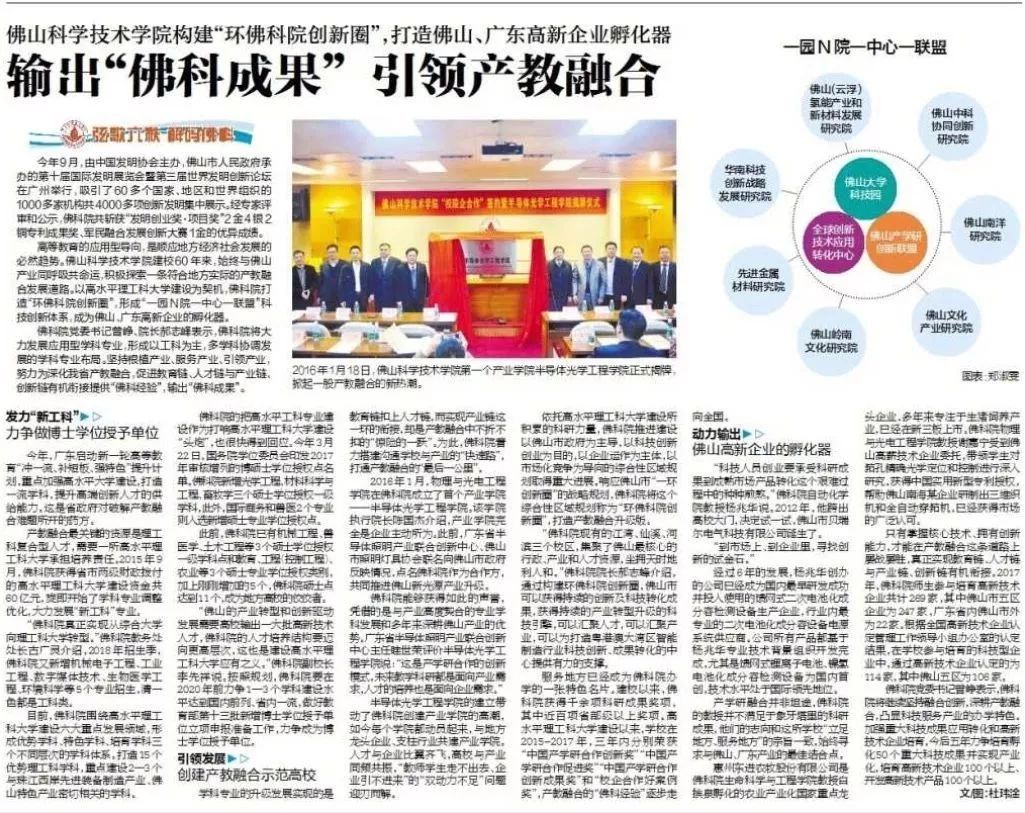佛山科学技术学院建校60年来,始终与佛山产业同呼吸共命运,积极探索一条符合地方实际的产教融合发展道路。以高水平理工科大学建设为契机,佛科院打造“环佛科院创新圈”,形成“一园N院一中心一联盟”科技创新体系,成为佛山、广东高新企业的“孵化器”。