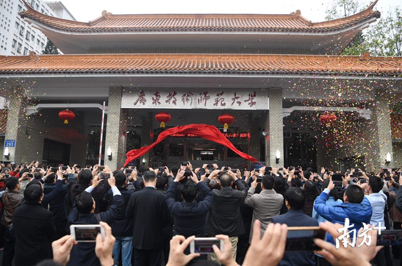 “三、二、一、揭牌!”18日早上,广东技术师范大学举行揭牌仪式,随着红绸的揭下,古色古香的校门上露出新校名“广东技术师范大学”红色大字,仪式简单而隆重,来自全国各地的校友与学校师生共同见证了这一时刻。