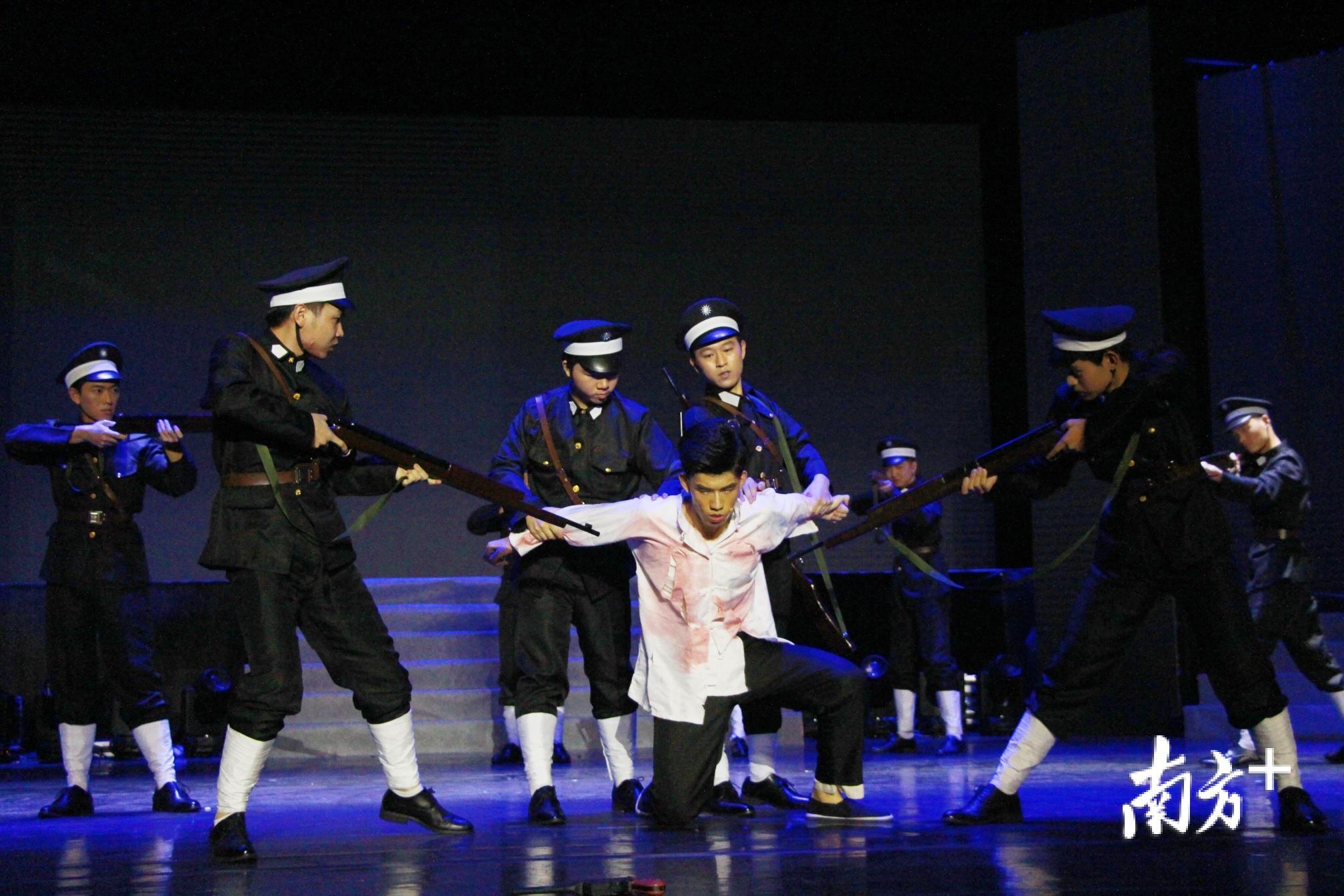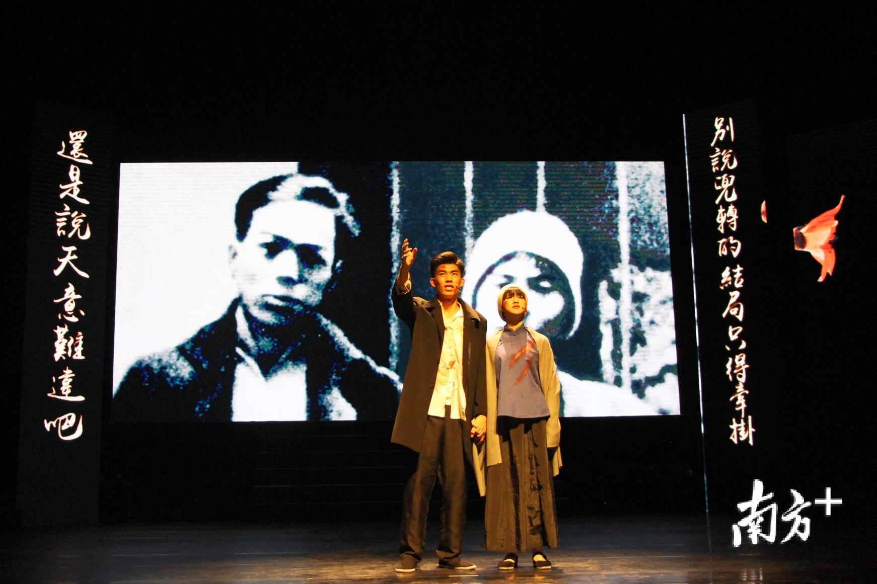 幕布缓缓拉开,悠扬的背景音乐徐徐传来,舞台上渐渐出现周文雍、陈铁军等革命先辈的影像。“头可断,肢可折,革命精神不可灭。壮士头颅为党落好汉身躯为群裂!”“现在我们要结婚了,让这刑场作为我们结婚的礼堂!让反动派的枪声,作为我们结婚的礼炮吧!”……震撼人心的台词一直在场馆内回响。