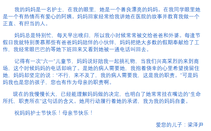 在护士节和母亲节来临前,妈妈收到了你的祝福,我真的很开心。然而,在你成长岁月中,最让我刻骨铭心的不是你的欢声笑语,而是因无法给予的母爱和关心所带来的内疚与遗憾。由于工作,你不能像其他孩子一样拥有妈妈的精心呵护,幼儿园、小学也很少陪伴你,关注你的成长。你说妈妈作为母亲和护士具备爱心、善良,但是温柔不全是给予家人和孩子,更多的给了病人。