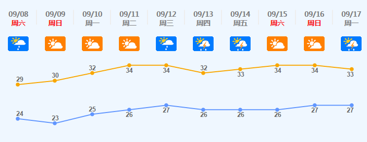 据气象局预报,白露这天,佛山降雨降温明显,最低气温将降至24℃。不过,本次降温较为短暂,9日起,佛山雨势减弱,最高气温将重返“3字头”。