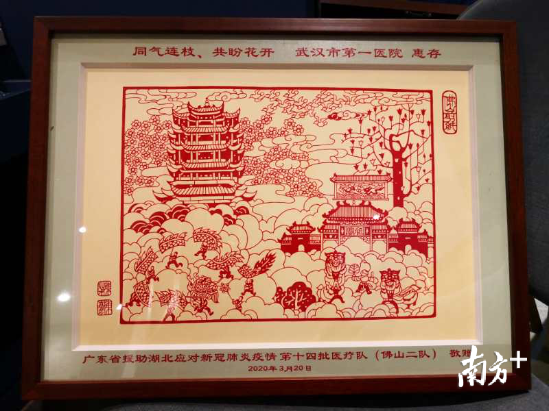 何明丰还代表佛山医疗二队向武汉市第一医院赠送了由佛山剪纸大师陈永才和陈嘉彦老师共同创作的剪纸作品《同气连枝共盼花开》,寄托佛汉人民同气连枝,共盼春暖花开之情。