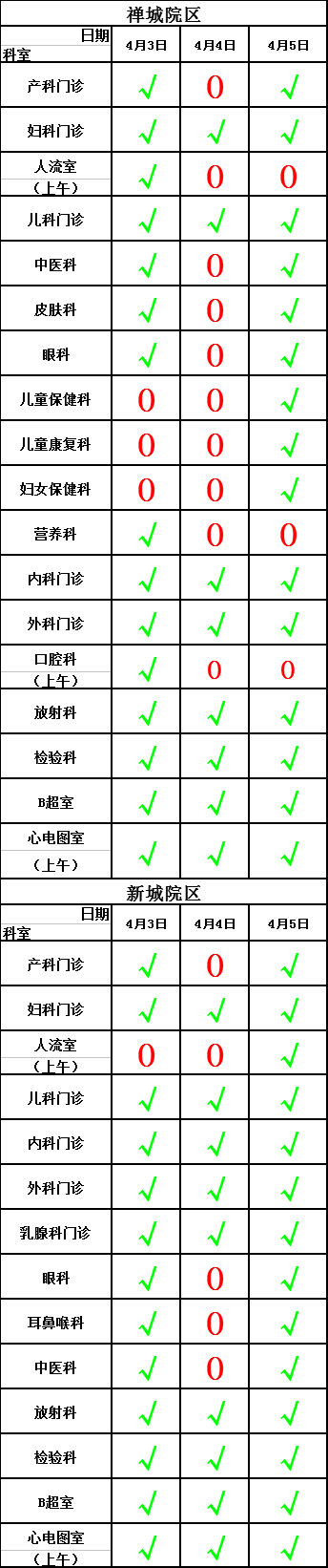 3、新城院区妇女保健科、儿童保健科、儿童康复科、营养科、皮肤科、口腔科、新筛中心门诊、妇产中心门诊停诊。
