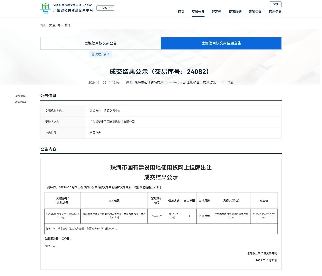 11月22日,横琴粤澳深度合作区落槌成交1宗6.67万平方米物流用地,成交价约1.29亿元,该地块由广东横琴澳门国际机场物流有限公司竞得,将用于建设澳门国际机场横琴前置货站。