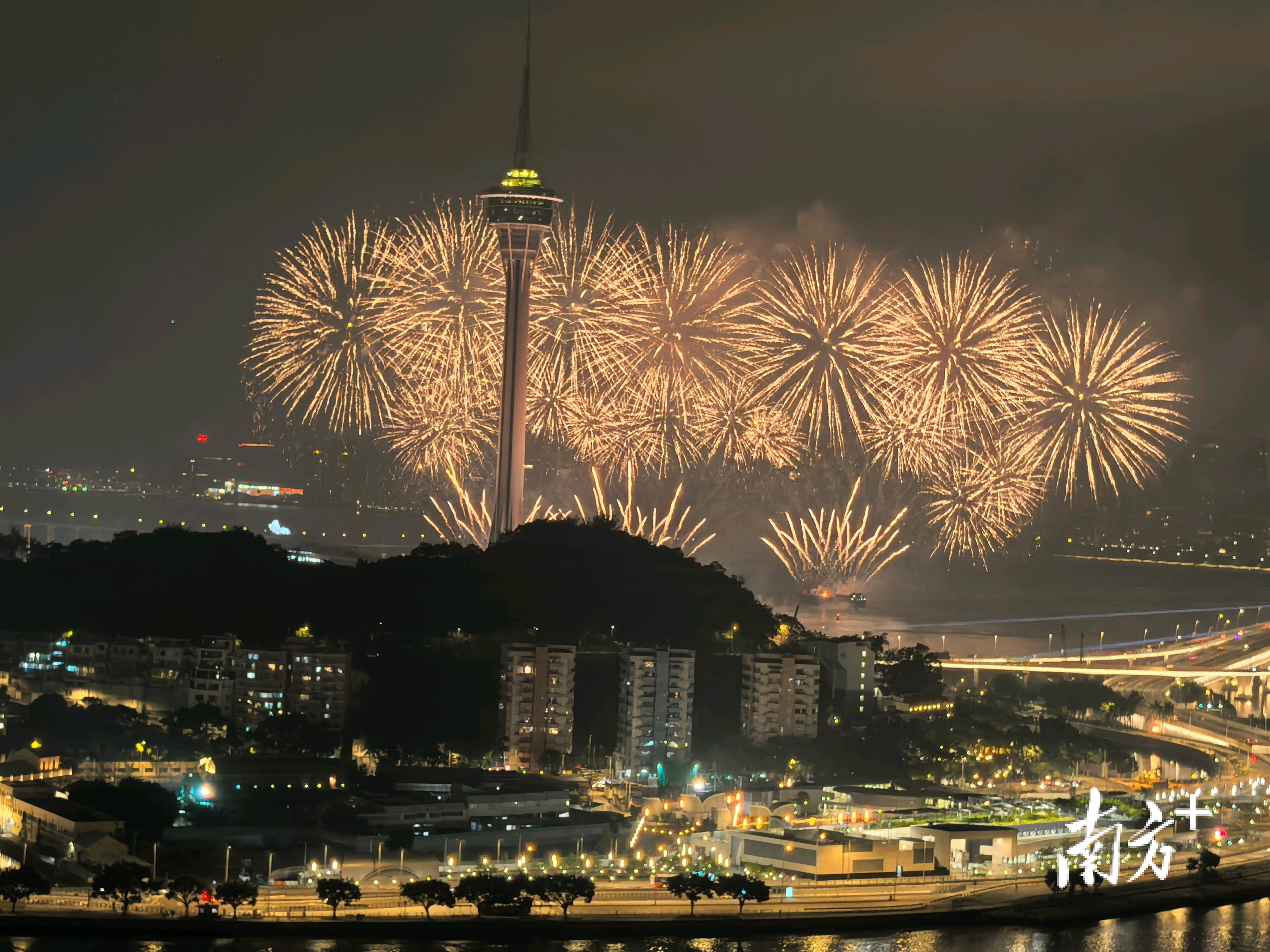 “庆祝澳门特别行政区成立25周年烟花表演”在澳门旅游塔对出海面上演。