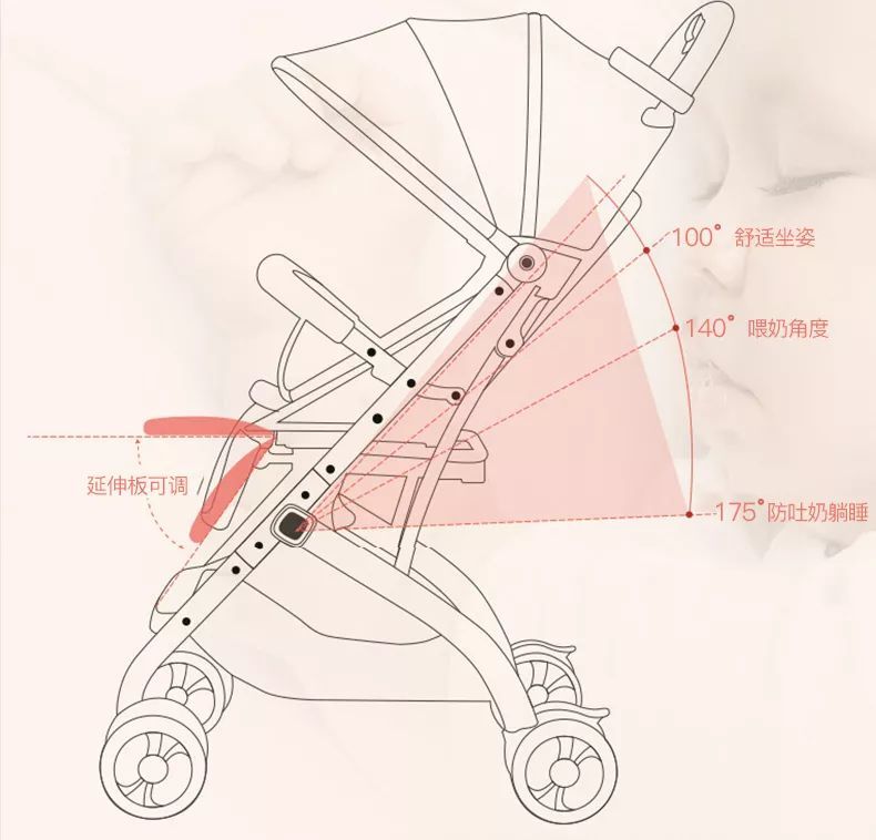 要选择椅背最大倾斜角度在150°~175°的婴儿推车。