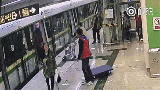 家长推着宝宝冲进即将关闭的地铁,导致婴儿车直接被地铁门夹变形。