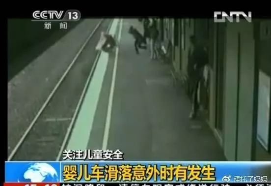 △女子等火车,忘记踩婴儿推车刹车,推车滑下月台。