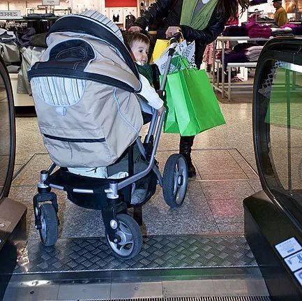 如果单独一人带宝宝出行,最好选择升降电梯。选择坐扶梯,应一人抱孩子,另一人推车。
