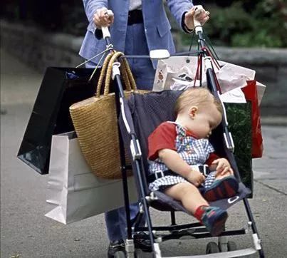 家长推着宝宝去购物时,习惯性把东西挂在扶手处,但重量失衡的话很容易引起翻车的危险。
