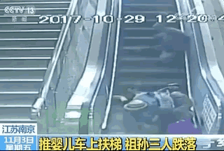女子将婴儿推车推上自动扶梯,电梯上升时摔倒。站在前面的奶奶想回身帮忙,祖孙三人一起摔下电梯。