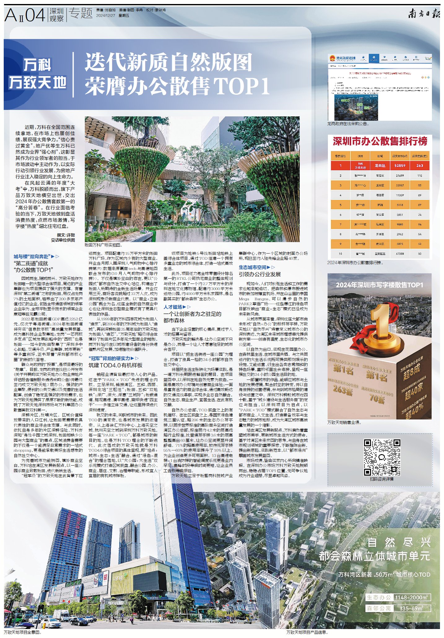 一部懂城市的作品,能顺应城市与土地的发展逻辑,契合时空的转变,并以自身独特的运营逻辑,参与到城市格局的建设与运营之中。深圳万科耕耘城市近四十载,基于“城乡建设与生活服务商”的定位与担当,以深圳项目为启点,以“PARK×TOD”模式融合了自然生态与都市商业、人文生活,打造兼备效率与生态魅力的城市地标,成为大湾区城市高质量发展的一个缩影。