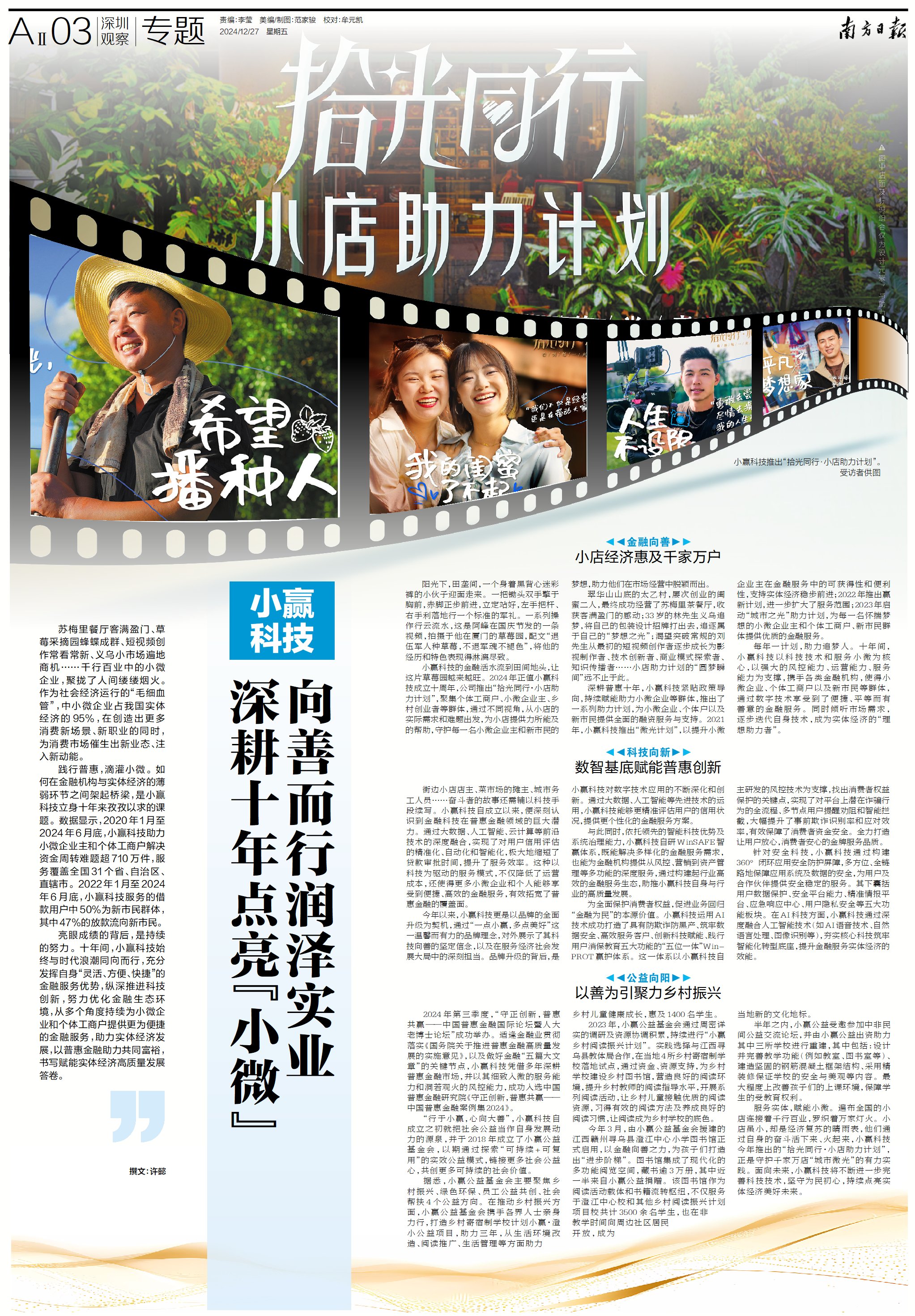 小赢科技的金融活水流到田间地头,让这片草莓园越来越旺。2024年正值小赢科技成立十周年,公司推出“拾光同行·小店助力计划”,聚集个体工商户、小微企业主、乡村创业者等群体,通过不同视角,从小店的实际需求和难题出发,为小店提供力所能及的帮助,守护每一名小微企业主和新市民的梦想,助力他们在市场经营中脱颖而出。