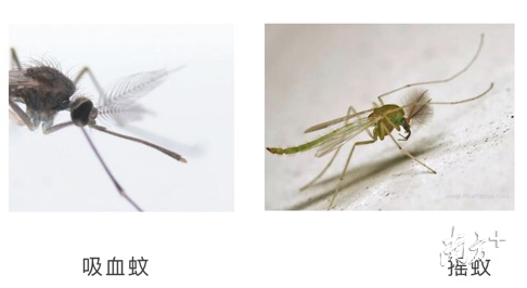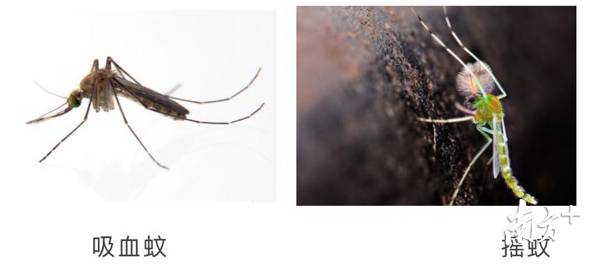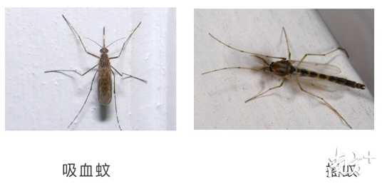 其二看嘴:吸血蚊都有个针状的“大长嘴”,专门吸血用,而摇蚊的嘴小到看不见,只能摄取些植物汁液。