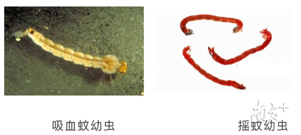 其五看幼虫:吸血蚊幼虫一般为偏黄的透明色,生活在树洞、竹筒的积水里,而摇蚊的幼虫通体红色,又称水蚯蚓/红线虫,一般在污水沟、排水沟、码头附近聚集。