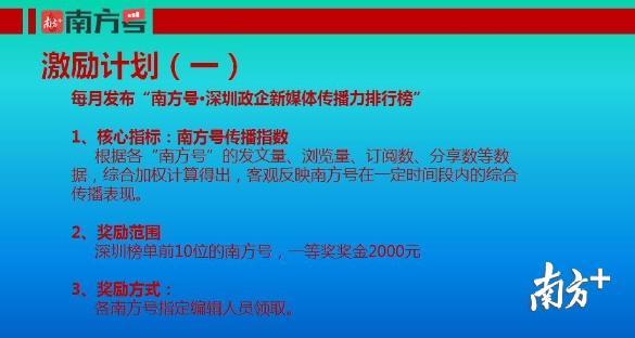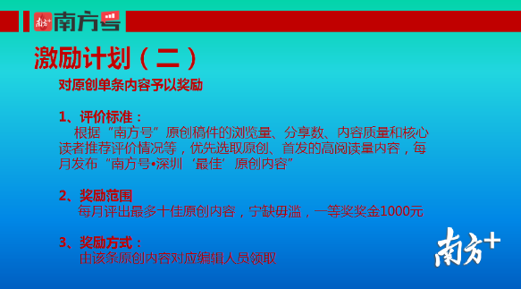现在,为进一步推动南方号·深圳矩阵内容品质、服务能力提升,更好依托南方+平台在更大范围讲好深圳故事、传播好深圳声音,共同巩固壮大深圳移动端主流舆论阵地,南方+客户端特制定南方号·深圳政企新媒体原创内容激励计划,对那些入驻“南方号”的深圳政企新媒体及其编辑人员进行奖励。