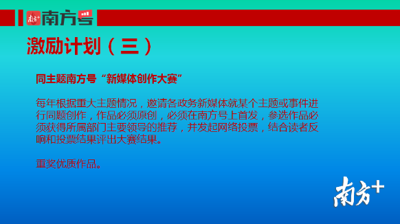 此外,南方+客户端每年根据重大主题情况,邀请各政务新媒体就某个主题或事件进行同题创作,作品必须原创,必须在南方号上首发,参选作品必须获得所属部门主要领导的推荐,并发起网络投票,结合读者反响和投票结果评出大赛结果。对于优质获奖作品,南方+客户端将进行重奖奖励!