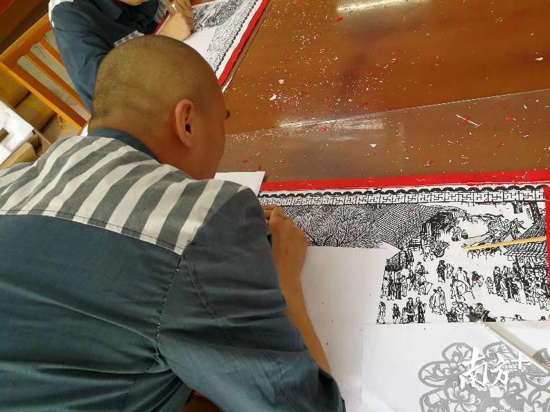此次的参赛作品《清明上河图》剪纸长卷,是由服刑人员叶某等七人共同完成。叶某2014年被送至深圳监狱服刑,师范学校美术班毕业的他,参加了狱内剪纸班,将遗弃很长时间的美术手艺重新捡起来。一个月前,在监狱警察的建议下,叶某等开始利用劳动、教育的间隙时间进行创作。8米的长卷,细小的人物,每一次下剪刀都是小心翼翼。