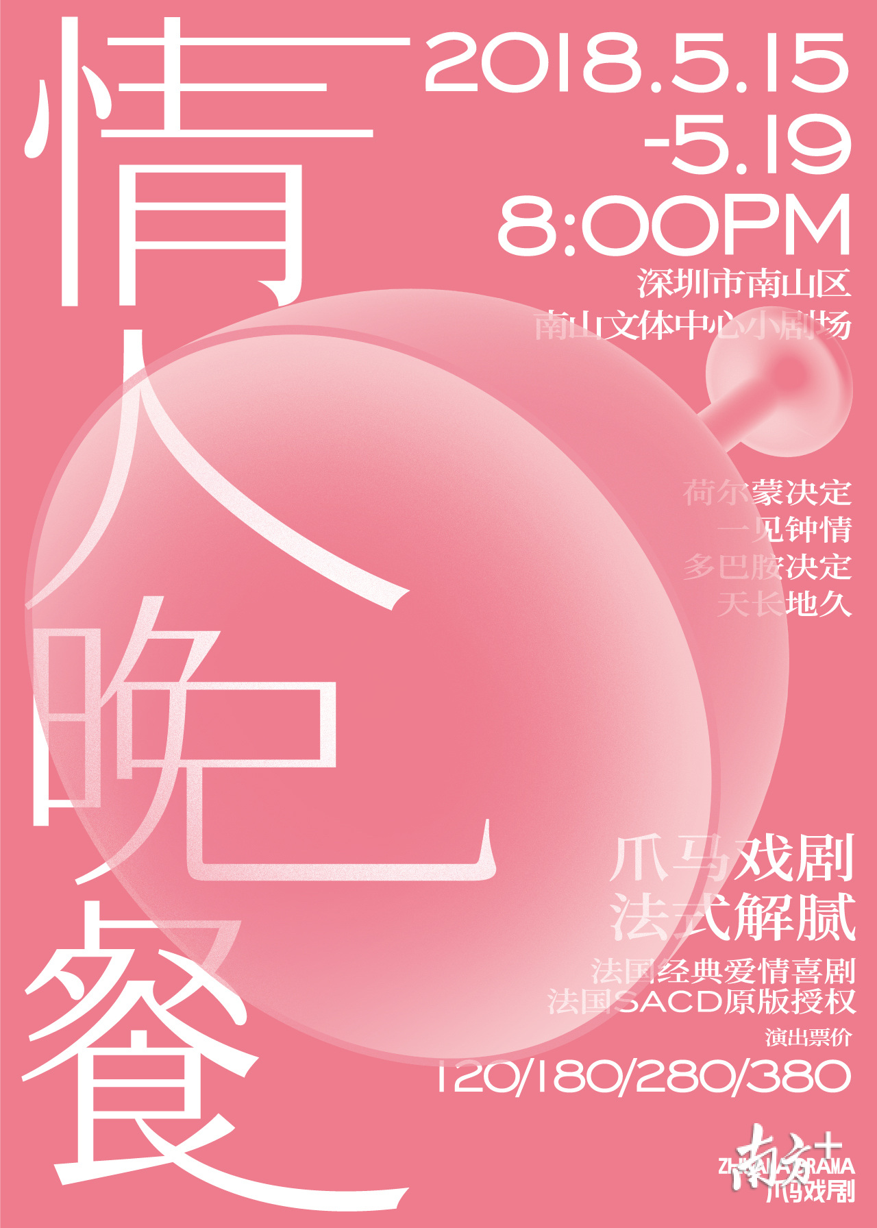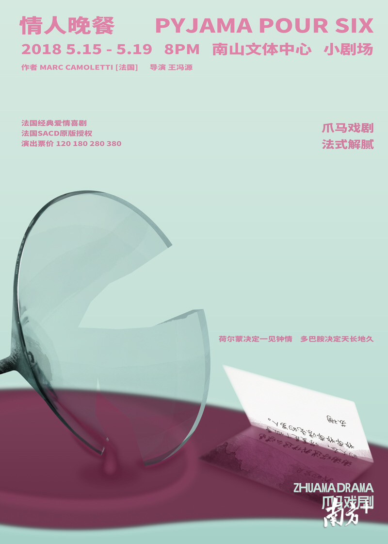 即将于5月15—19日晚在南山文体中心小剧场上演的是爪马年度新戏——法式爱情喜剧《情人晚餐》,该剧获得法国SACD机构正版授权,将法国剧作家马克·卡莫莱特(Marc Camoletti)的经典喜剧《Don’t Dress For Dinner》进行本土化改编,但仍保留原剧浓郁的法式风情。