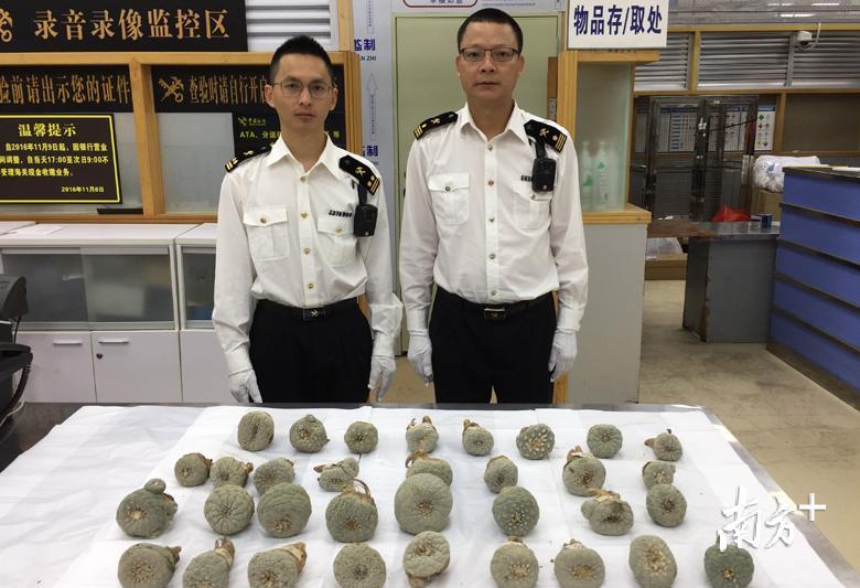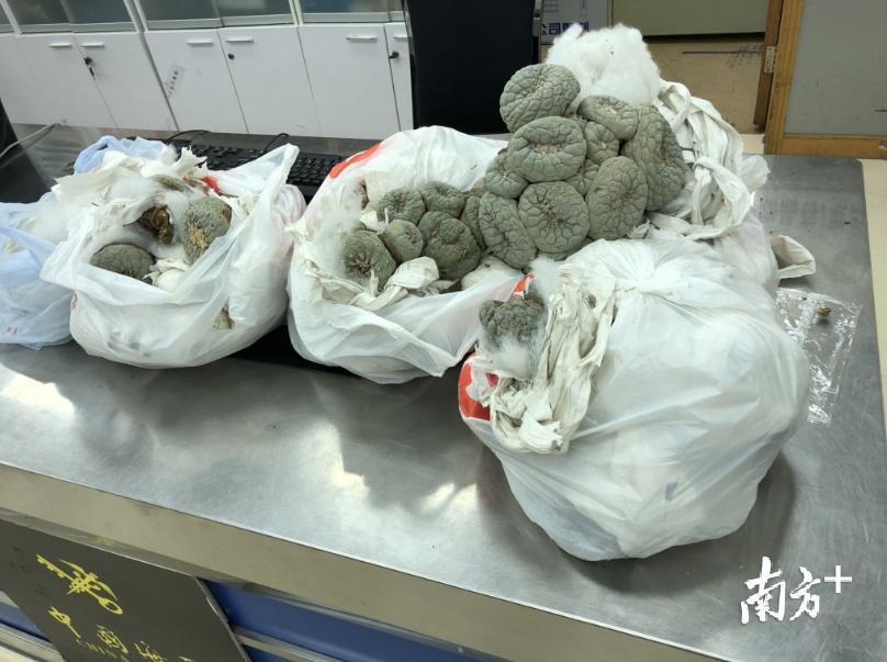 “当时这些植物就放在旅客的行李箱中,每一个都用白纸包裹着,外形是不规则的球状。我们起先还以为是水果莲雾,或是什么蘑菇。打开白纸以后,才发现全部都是多肉植物,几乎每一株都带着根系和泥土。这些多肉植物呈灰绿色或者深绿色,表皮上有一些白色的粉末,非常柔软。”查验关员老林说。