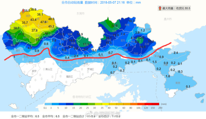 【降雨预计持续至0点前后】目前深圳全市大部分地区都已降雨,老虎坑站依旧占据最大累计雨量宝座(55.9mm),南山、福田、罗湖、盐田和大鹏也将陆续进入雨区,降雨预计持续至00:00点前后。