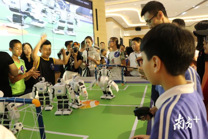 “哇!进球了!太棒了,这些机器人!”5月27日下午,深圳龙华区锦绣科学园7栋1楼多功能会议厅内阵阵欢呼声震耳,第十四届文博会锦绣杯机器人运动会科技创新文化大讲堂活动拉开帷幕,现场有青少年机器人运动会及科创界大咖带来的5G光通讯、人工智能以及创客教育论坛分享。