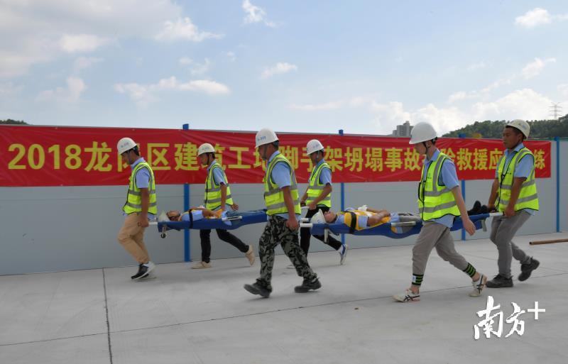 “报告!报告!A街道某工程发生脚手架倒塌,伤员人数未知,有人被困,险情十分危急,请立即拨打110、120!”“根据险情及该项目主体情况,启动四级应急响应。”7月10日下午,由龙岗区住建局牵头举办的“建筑工地脚手架坍塌事故抢险救援应急演练”活动在龙城街道某科技园项目工地举行。活动旨在有效应对龙岗住建领域突发事件,全面提高责任部门应急能力、抢险能力,提高应对突发事件的操作性、联动性和实战性。