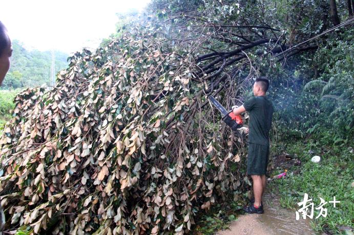 9月17日,超强台风"山竹"逐渐远离深圳,受台风影响,大量树木散落在马路或行人路上,给交通带来不便。深圳边防支队组织近200名官兵对辖区内道路进行清洁,帮助驻地群众恢复生产作业。