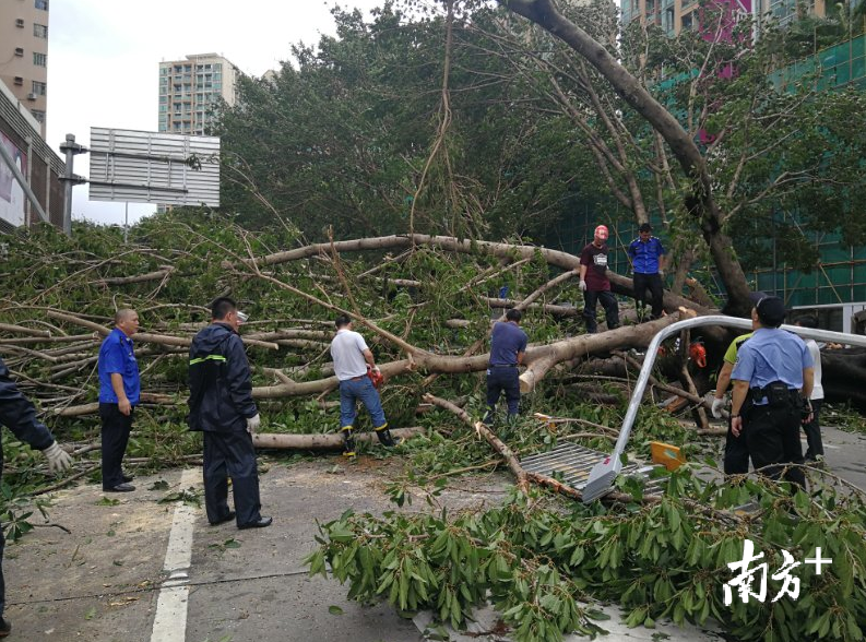 台风“山竹”过后,许多街道两旁的大树被台风吹倒,严重阻碍了车辆通行。16日下午3时,台风风力略微减弱后,东湖街道成立了40人的应急分队对辖区内道路旁的倒伏树木进行清理。截至17日下午5时,这支队伍已经连续作业超过一天一夜,清理了300多棵倒伏树木。