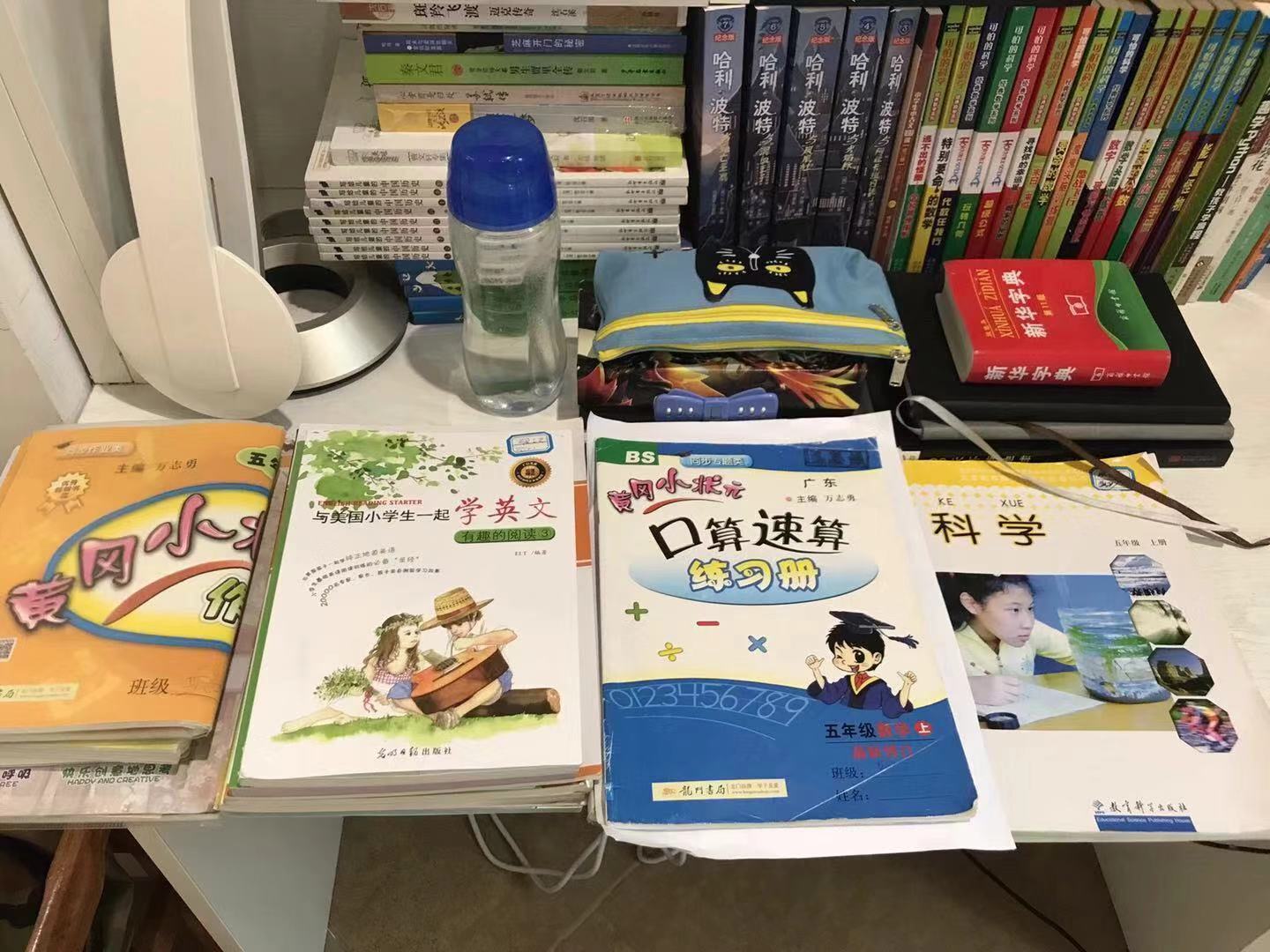 分解如下:语文6本,英语9本,数学5本,科学2本,试卷三张,笔记本两个,字典一本,课外书一本(学校要求带),笔袋两个,水杯一个。(合计约10斤)