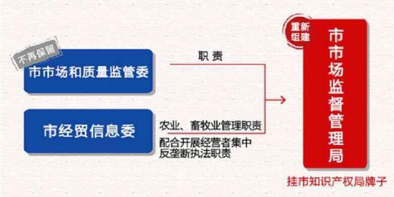 根据《深圳市机构改革方案》,深圳市重新组建市市场监督管理局。本次机构改革将市市场和质量监督管理委员会(市食品药品监督管理局、市市场监督管理局<市知识产权局、市质量管理局>)的职责,市经济贸易和信息化委员会的农业、畜牧业管理职责以及配合开展经营者集中反垄断执法职责整合,重新组建市市场监督管理局,加挂市知识产权局牌子。