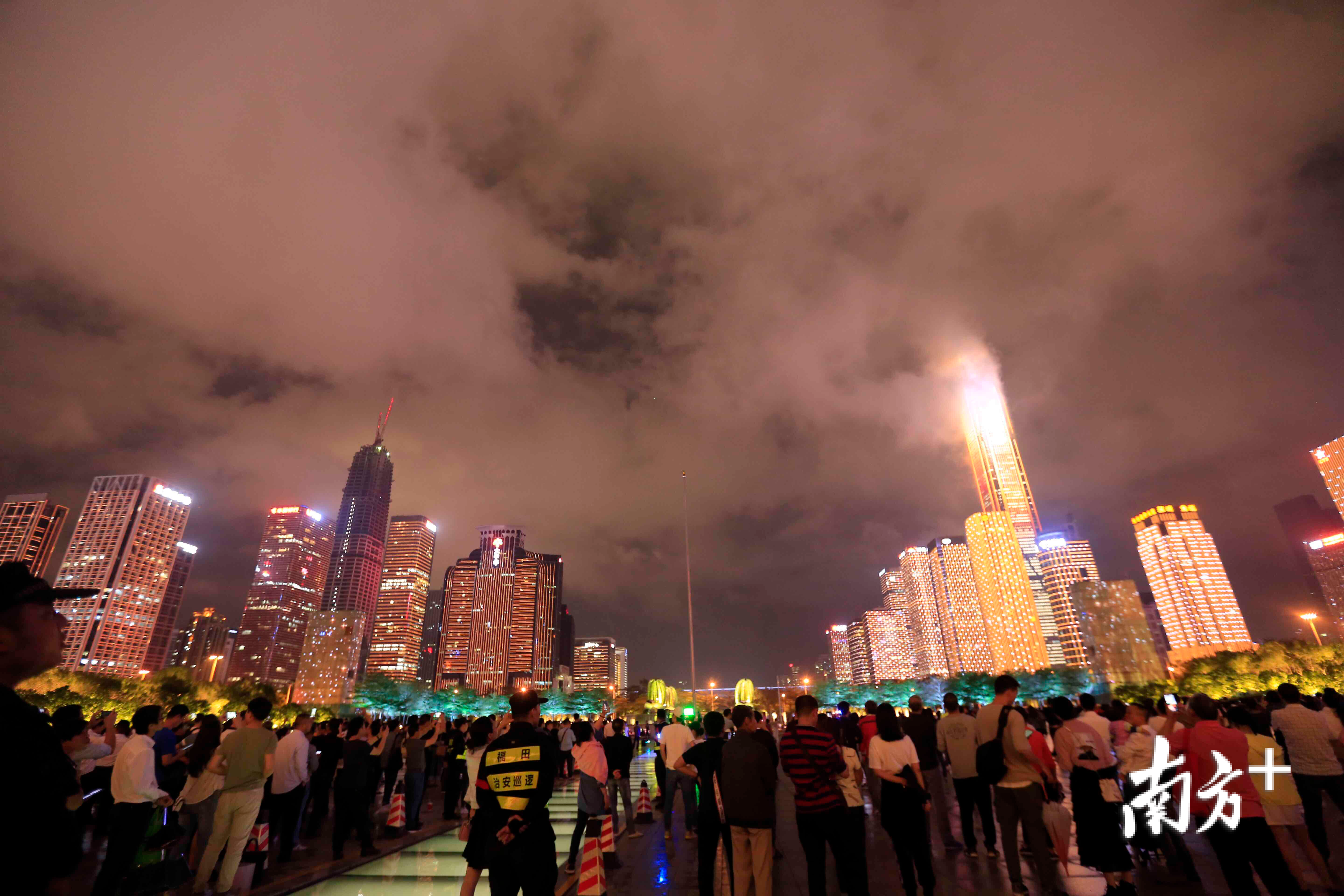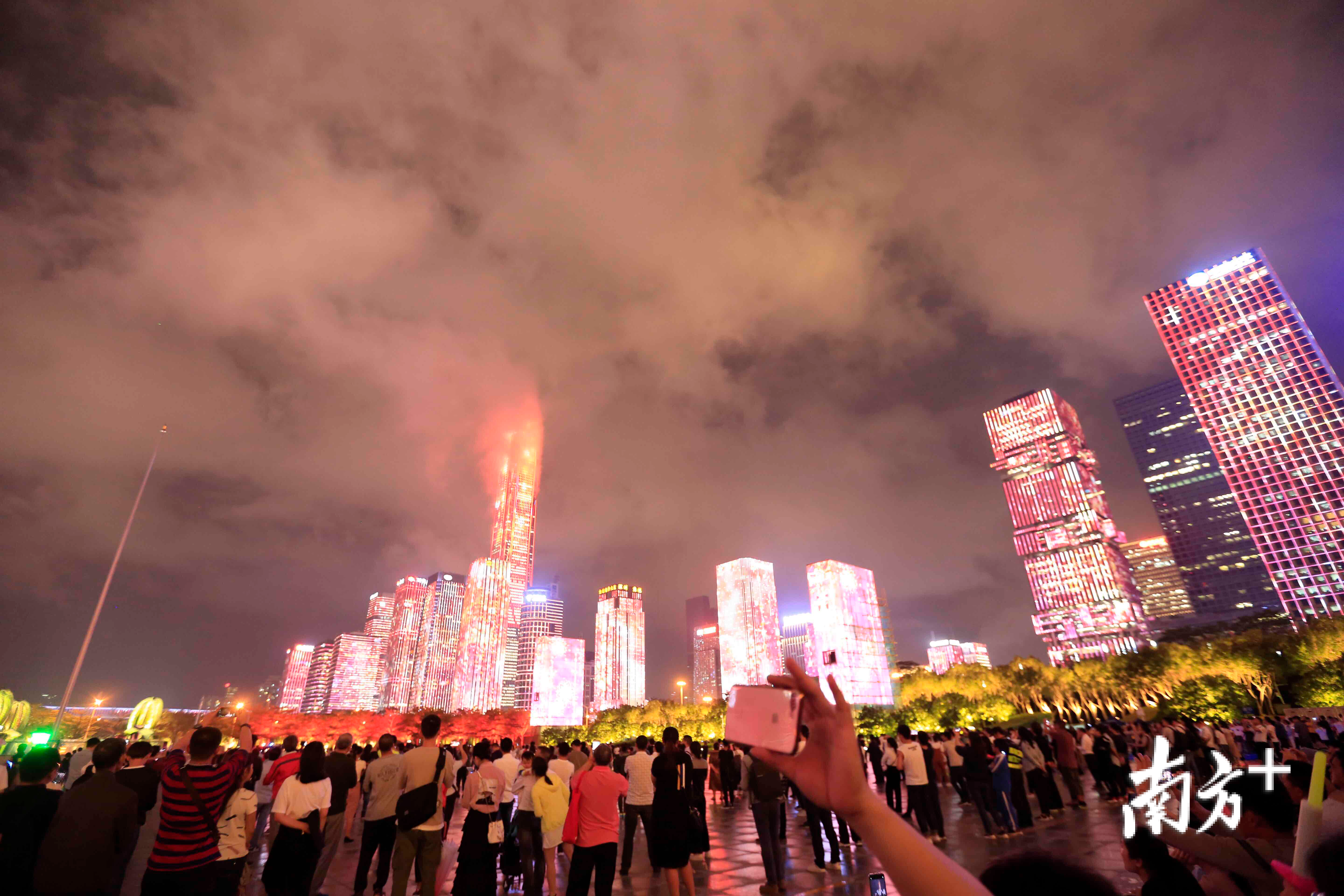 3月29日深圳上空云雾缭绕,升级版首场灯光秀于19:30准时上演,深圳市民早早守候在市民中心广场看秀。