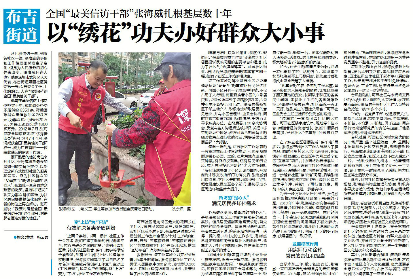 从扎根信访十年,到服务社区一线,张海威的身份和工作性质虽然发生了变化,但是为人民服务的初心并未改变。张海威何许人也?他是深圳市龙岗区人大代表、布吉街道可园社区党委第一书记、居委会主任、工作站站长,人称“微笑哥”的全国“最美信访干部”。