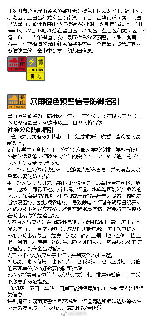 深圳市气象台于2019年05月28日10时30分,将福田区,罗湖区,南山区,盐田区,龙岗区,龙华区,坪山区,大鹏新区和东部海区暴雨黄色预警升级为橙色,全市进入暴雨防御状态,请注意防御。