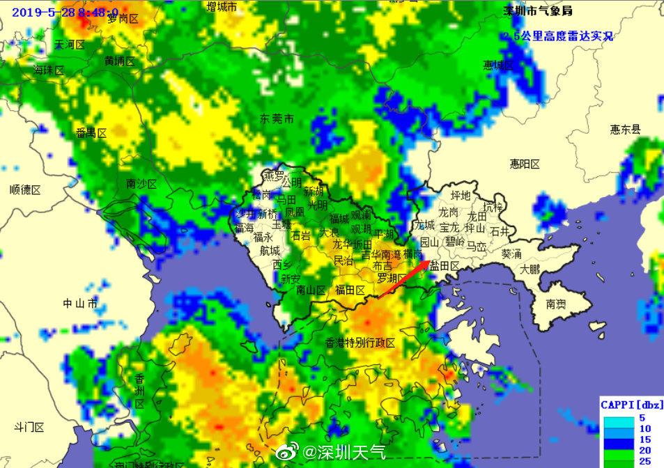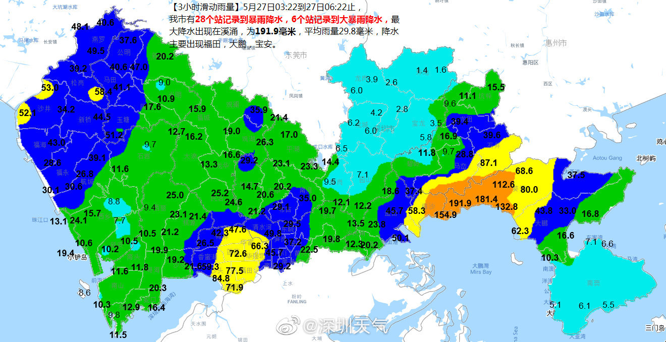 因此,深圳市气象台于5月28日09时15分,将暴雨黄色预警扩展至全市,全市进入暴雨戒备状态,请注意防范。