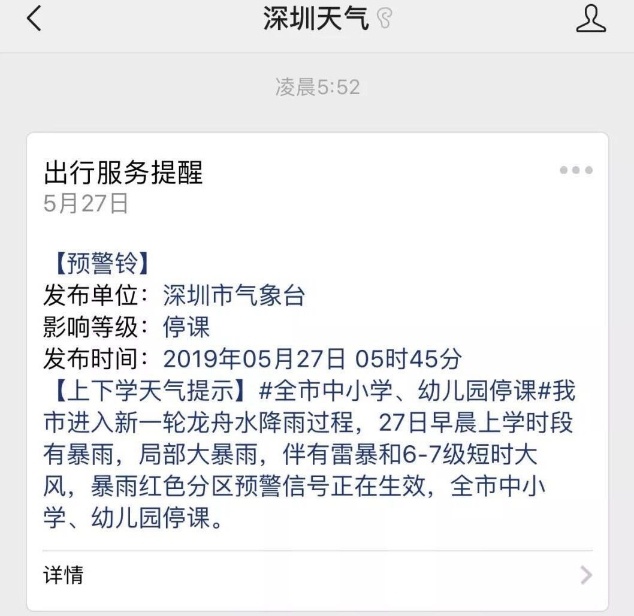 预计早晨6-9时,全市阴天有暴雨,局部大暴雨伴有雷暴和6-7级短时大风,暴雨红色分区预警信号生效中,请市民远离低洼易涝区、危房、边坡、简易工棚、挡土墙、河道、水库等可能发生危险的区域,注意交通安全。 深圳市气象台2019年05月27日05时38分发布。