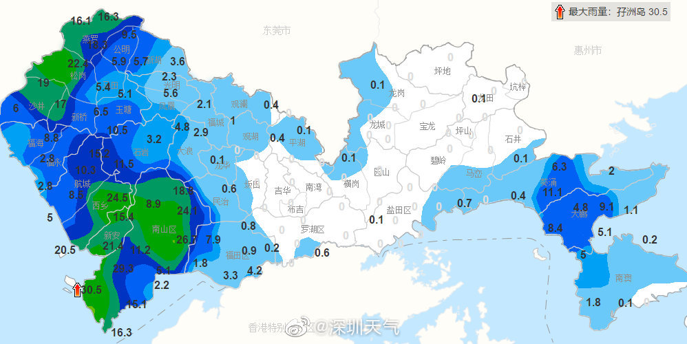 深圳平均雨量 45.5 毫米,各区中平均雨量最大 86.7 毫米(福田区),其次是 75.5 毫米(大鹏新区);最大累计雨量 244.9 毫米,最大小时雨量为 101.7 毫米,均出现在大鹏新区溪涌站。 深圳天气表示,近期深圳已经进入新一轮龙舟水降雨期,龙舟水降雨具有“累计雨量大,短时雨强强,局地差异大”的特征。