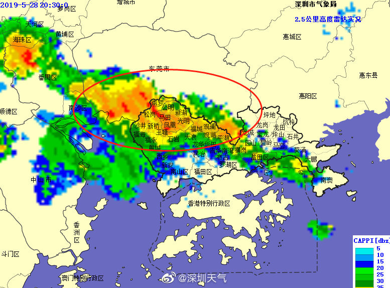 深圳市气象台于5月28日20时50分发布分区暴雨黄色预警,预计光明区,坪山区,宝安区(石岩、沙井、新桥、燕罗、福海、福永、松岗、航城街道),龙岗区(坂田、平湖、坪地、宝龙、龙岗、龙城、园山、吉华街道)和龙华区(龙华、大浪、观湖、福城、观澜街道)未来1小时内将出现20-40毫米降水,全市进入暴雨戒备状态。