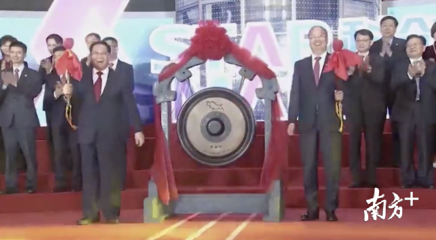 1500多公里外的上海证券交易所内,科创板刚刚敲锣开市开市。一只代码为688007的股票见证这段历史的开启,它是首批25家科创板上市公司之一,也是科创板广东的第一股——光峰科技。截止今日下午3时收盘,光峰科技股价为38.84元,首日涨幅121.94%。