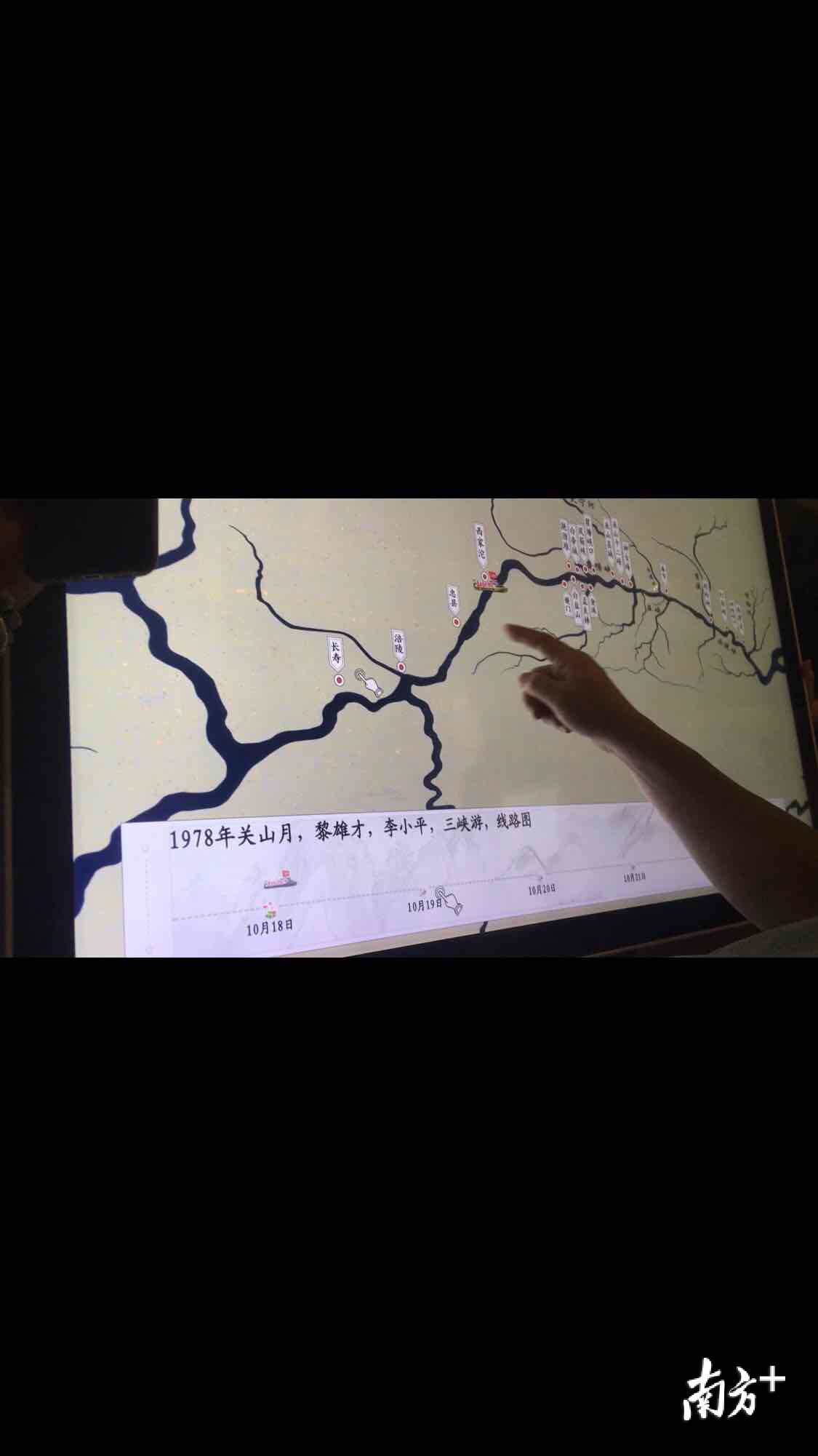 为了让大家能亲身感受关山月先生当年写生的情形,馆方开发了“关山月与近代以来的江峡图景”触摸屏展示软件,以1978年关山月、黎雄才、李小平三峡游历线路为主线,以关山月两本三峡速写本为依据,基于基础性研究,通过绘制数字三峡行径路线地图,将速写本图片、时间与实际地理位置一一对应,并以时间、地点两个维度生动展示关山月先生与友人同游长江之旅。