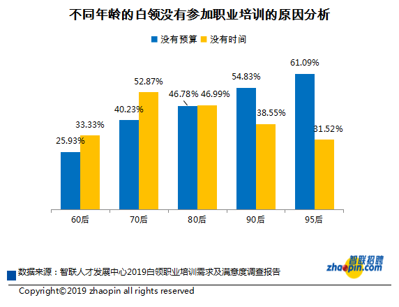 通过对白领没有时间参加职业培训的原因进行分析,发现其中超一半的70后、80后未能参加职业培训的主要原因没有时间;而近六成的90后、95后因为预算而止步,对于正面临或即将面临家庭压力的职场新人而言,职业培训也是不小的开销。