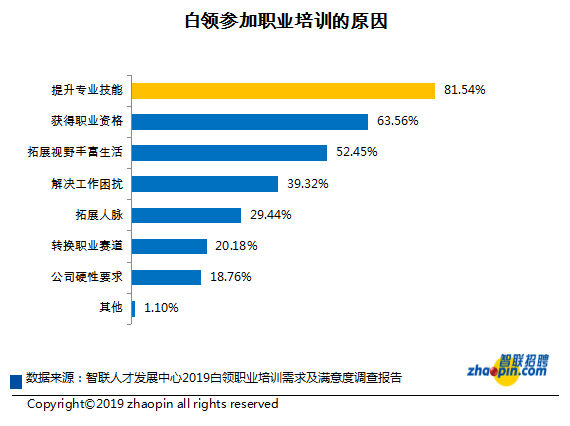 促使白领参加职业培训的原因有很多,提升专业技能、获得职业资格、拓展视野丰富生活是目前最为重要的三个因素,其中,提升专业技能为首要因素达81.54%,其次是获得职业资格占比63.56%。