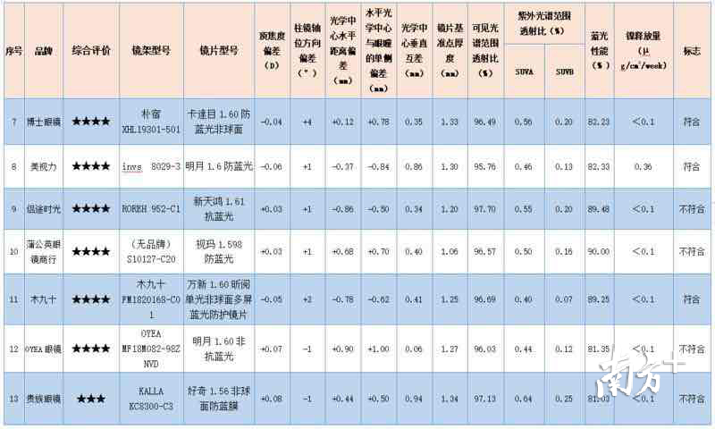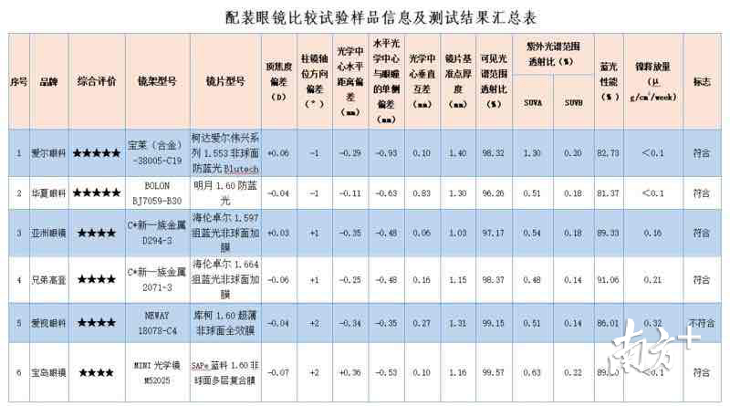 试验显示,参与比较的20款配装近视眼镜样品的光学要求、透射性能、镜架镍释放量、标志等方面的11项指标整体指标表现良好。绝大多数样品镜片的光透射性能表现良好,透光率高、防紫外效果佳。样品镜架的镍释放均在ISO国际标准要求范围内,安全性好。个别样品眼镜配镜单(即配镜处方)存在无产品执行标准、无厂址、无检验合格证明等不规范的问题。