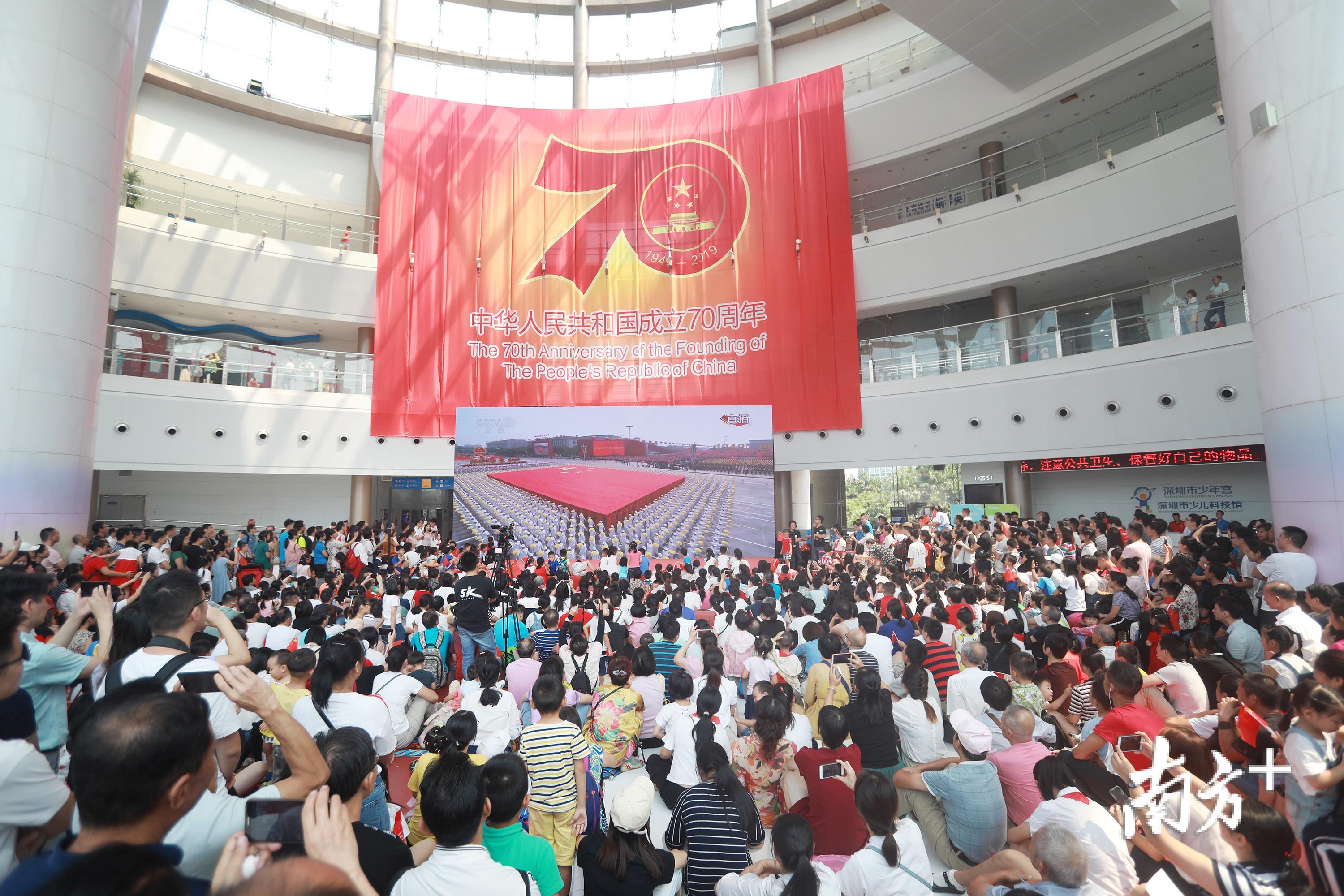 在深圳市少年宫,“中华人民共和国成立70周年”的大幅庆祝标语下,广大深圳少年儿童聚集起来,集体收看大屏幕上播放的国庆大会直播;在宝安区,塘尾万里学校教师李媚一家三代16人,从重庆、广州齐聚深圳,统一定制“我爱你中国”服装,上午10点准时收看阅兵仪式直播。在壹方城龙雕塑广场,来往的人们停顿下来,自发聚集在广场大屏幕下观看大会直播.....