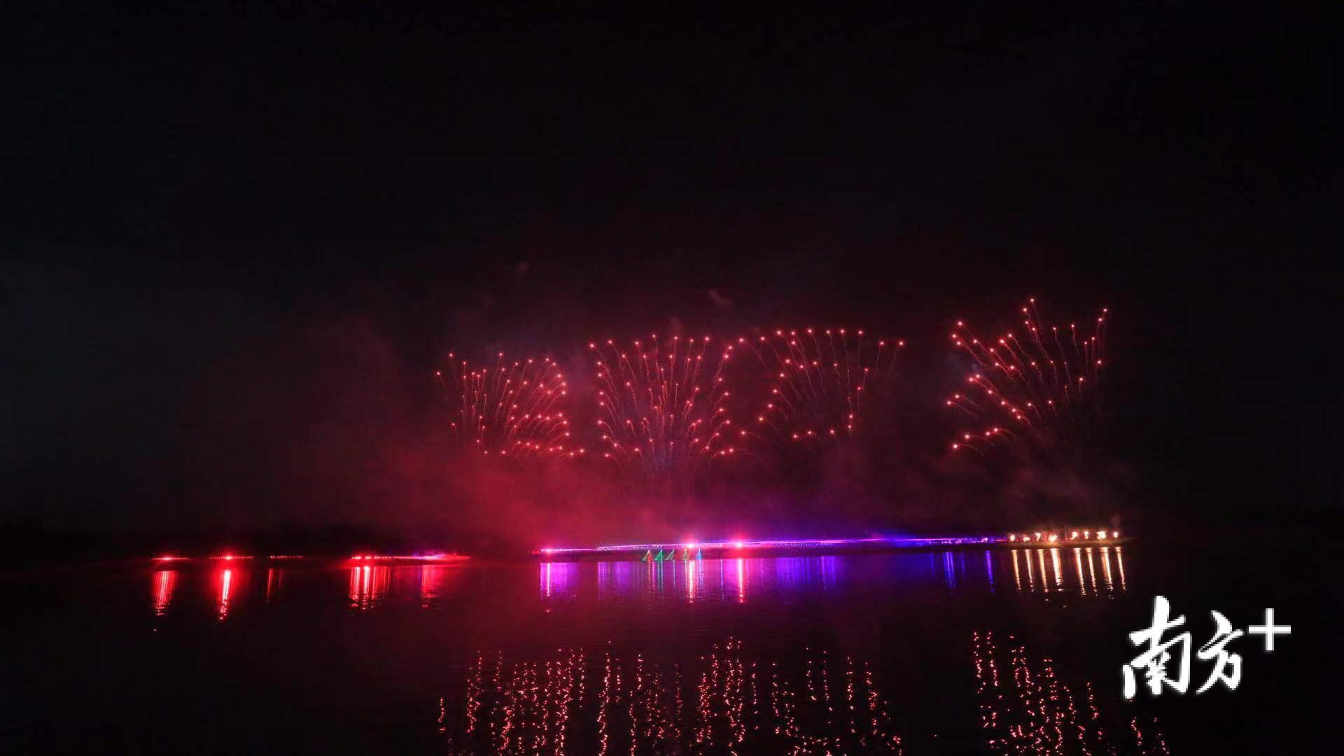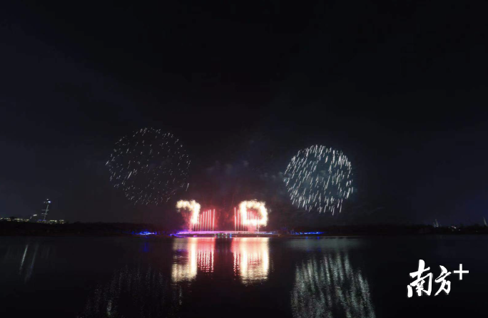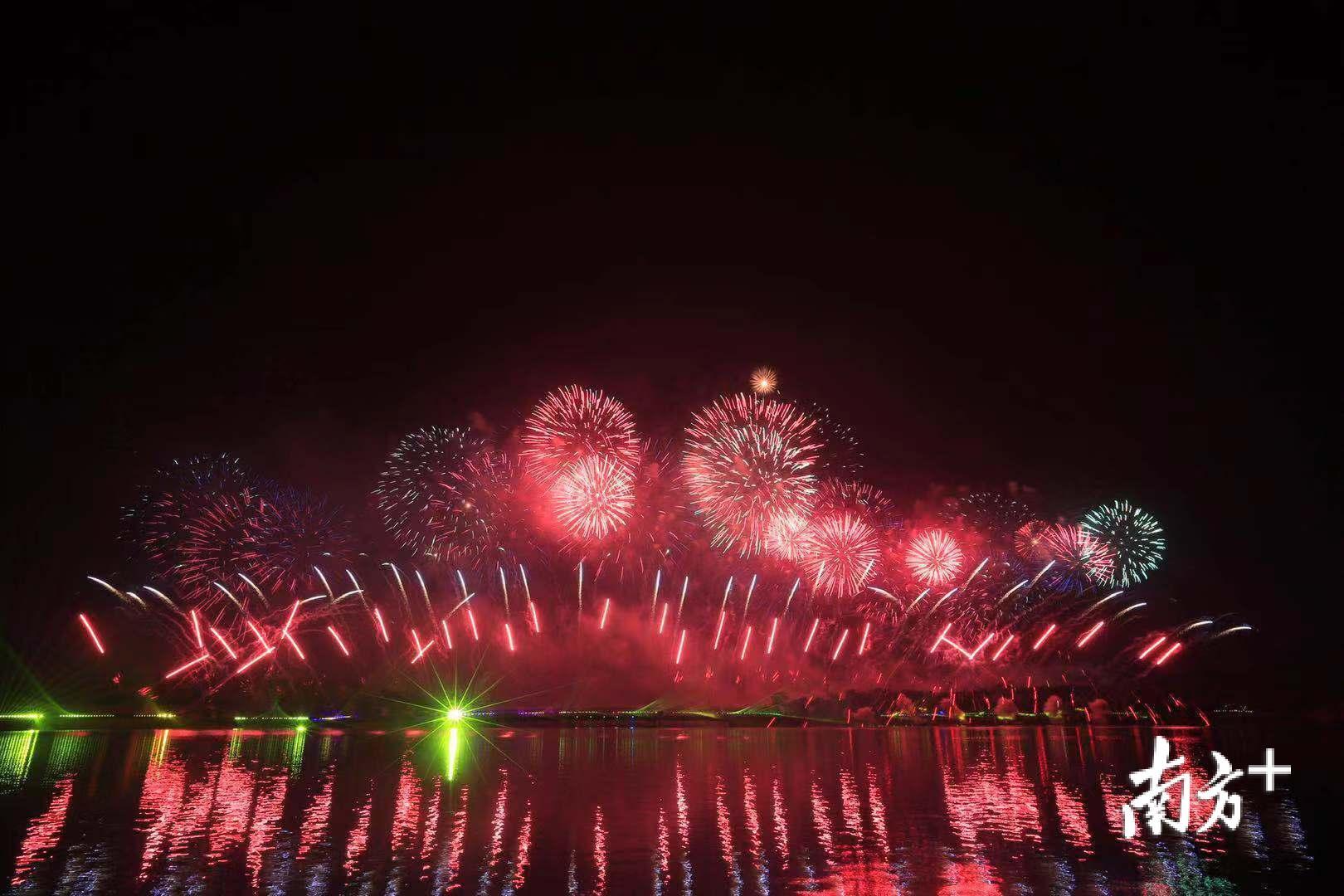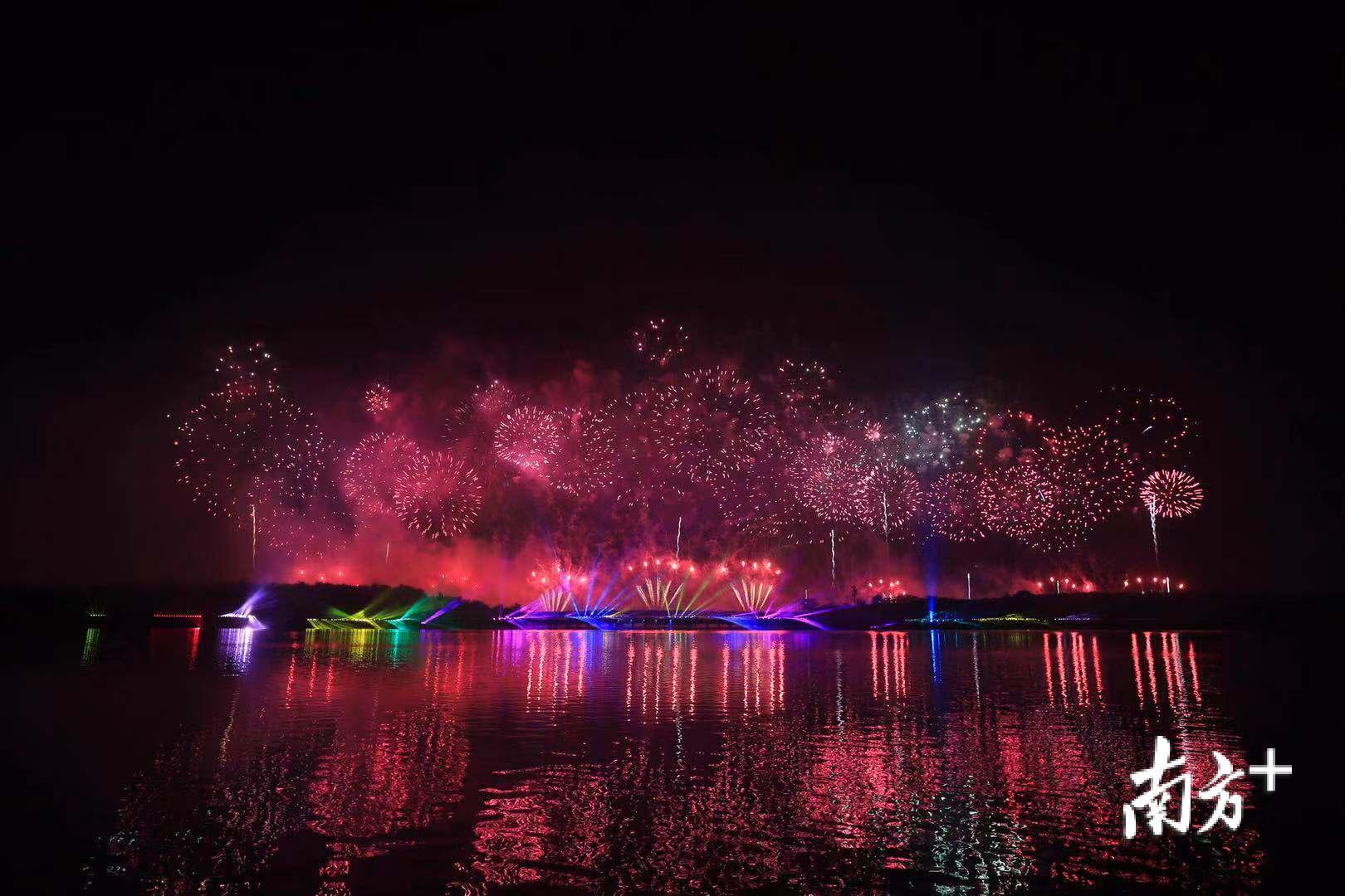 呈现出一场集焰火、楼宇灯光秀、湖面激光秀等为一体的绚丽视觉盛宴