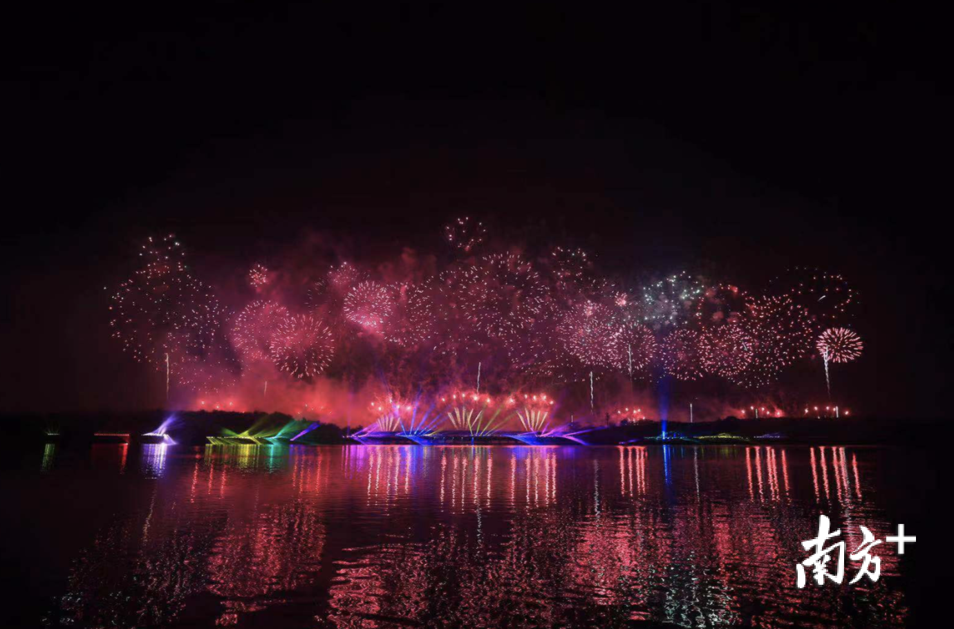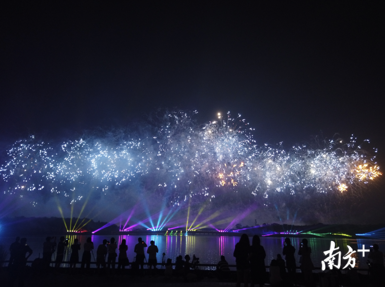晚上8时,烟花腾空,人才公园周边楼宇齐齐亮灯,一束激光点亮夜空,随着序曲《我和我的祖国》的优美乐声,焰火晚会在现场观众的欢呼声中拉开了序幕。